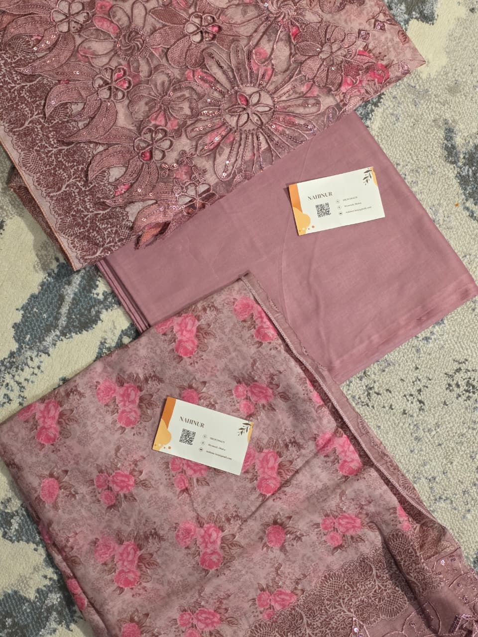 **SOLD OUT** This elegant unstitched 3-piece lawn suit features a soft dusty mauve / rosewood base, beautifully adorned with intricate mauve, antique pink, and subtle shimmering sequin embroidery forming delicate floral patterns on the shirt, paired with a coordinated solid mauve lawn trouser and a graceful printed chiffon dupatta in muted taupe-pink tones highlighted with floral motifs and an embroidered border, creating a perfectly balanced ensemble that feels romantic, refined, and ideal for festive or semi-formal wear.