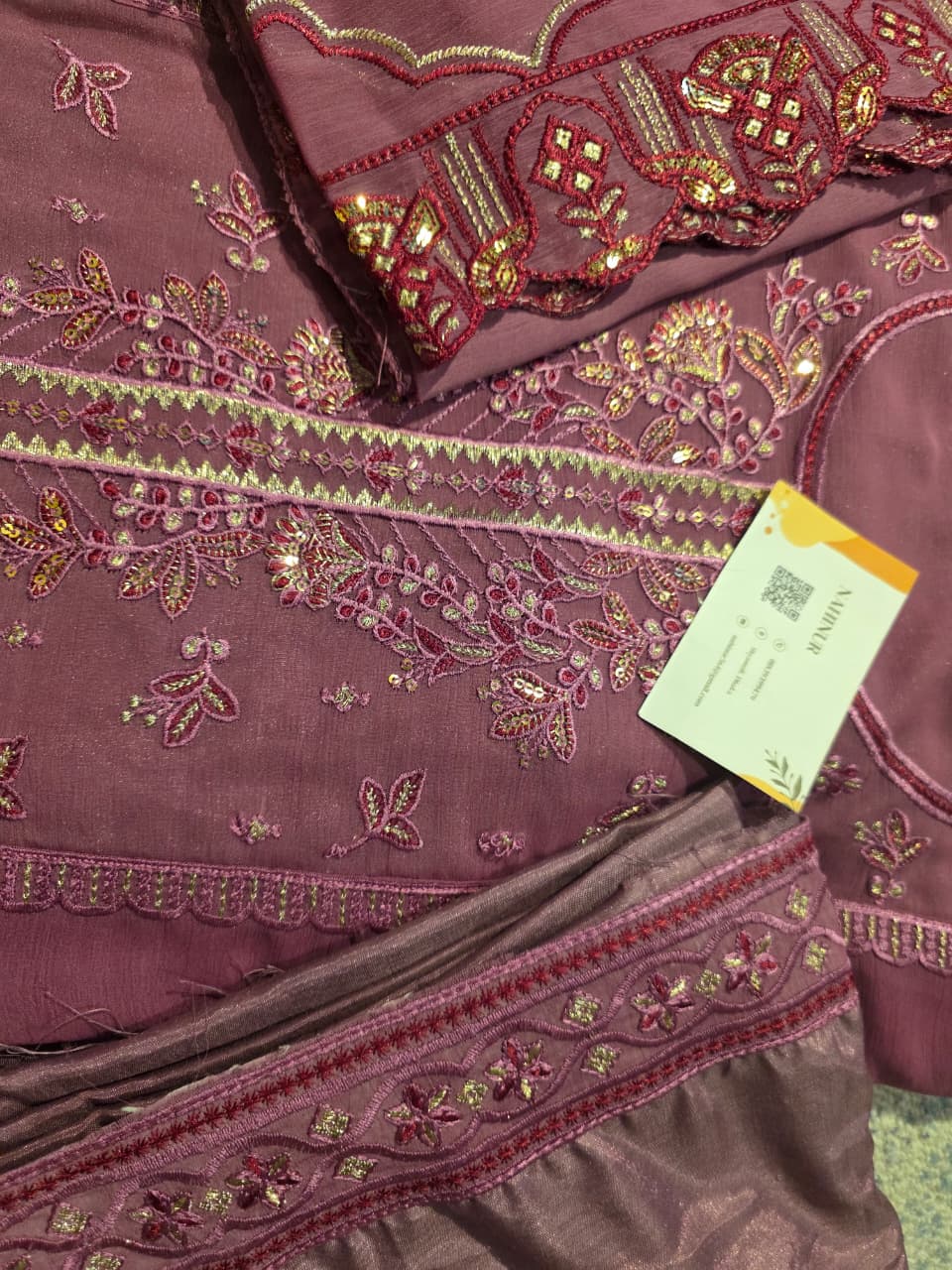 This elegant mauve embroidered suit set features intricate floral and vine embroidery with subtle sequin and thread detailing on a rich, graceful base. Paired with a beautifully embellished dupatta and matching bottoms, the ensemble offers a perfect blend of traditional charm and refined sophistication, making it ideal for festive gatherings, formal events, or special occasions.