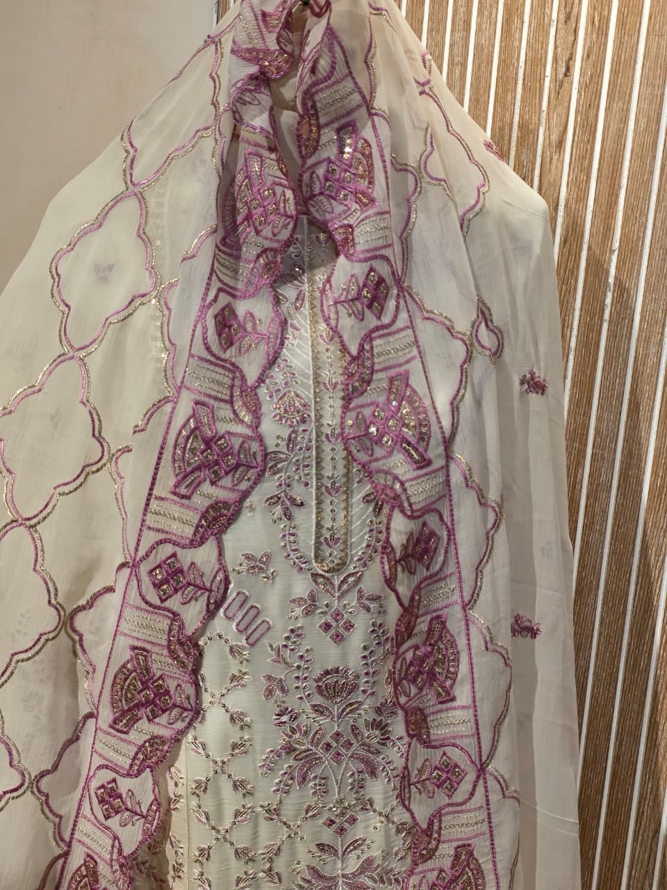 This graceful unstitched 3-piece lawn suit showcases a soft ivory/cream base adorned with intricate lilac, dusty mauve, and soft silver thread embroidery, featuring delicate floral and geometric motifs across the shirt and an elegantly embroidered hem; paired with a sheer ivory chiffon dupatta highlighted by detailed mauve and silver embroidered borders and subtle scattered motifs, this ensemble exudes timeless elegance and refined charm—perfect for festive, formal, or summer evening wear.