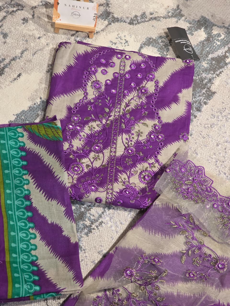 This elegant three-piece suit set features a striking royal purple and soft beige color combination that feels rich and graceful. The shirt fabric is primarily beige, beautifully accented with bold purple zigzag patterns and intricate purple floral embroidery enhanced with delicate silver threadwork and subtle embellishments, giving it a luxurious finish. The dupatta complements the outfit with a vibrant mix of purple, teal green, and beige, highlighted by traditional motifs and decorative borders that add depth and contrast. The plain trouser in a solid deep purple shade balances the overall look perfectly, keeping it refined and sophisticated. Altogether, the color palette and detailed craftsmanship create a timeless, festive look that’s perfect for formal gatherings and special occasions.