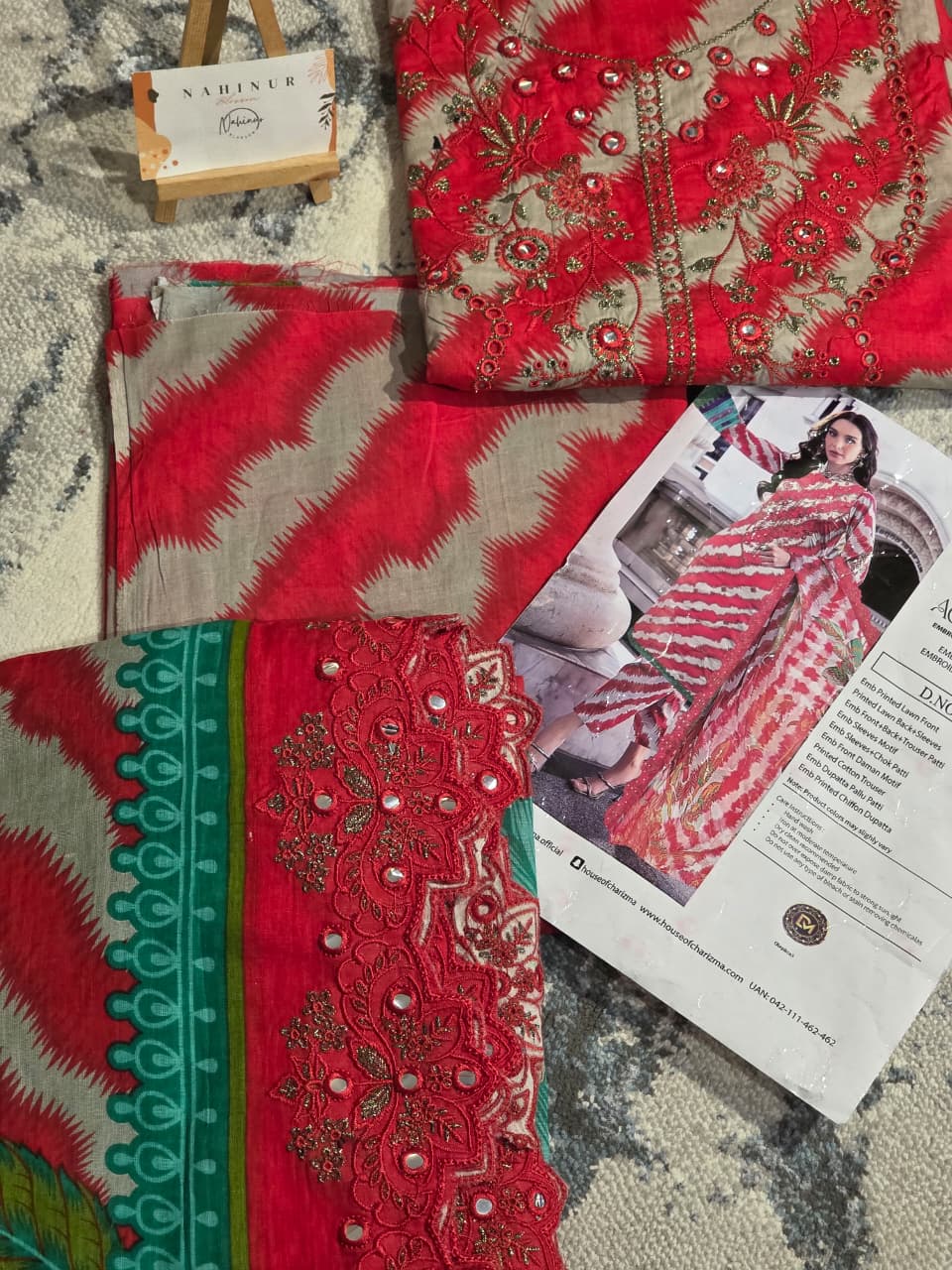 This elegant unstitched suit set features a striking combination of vibrant red and soft beige as its base colors, creating a bold yet graceful contrast. The shirt fabric showcases an eye-catching red tie-dye pattern over a beige background, beautifully enhanced with intricate golden and red embroidery along the neckline and front panel. Delicate embellishments with subtle mirror work add a touch of shimmer, giving the outfit a festive and luxurious appeal.