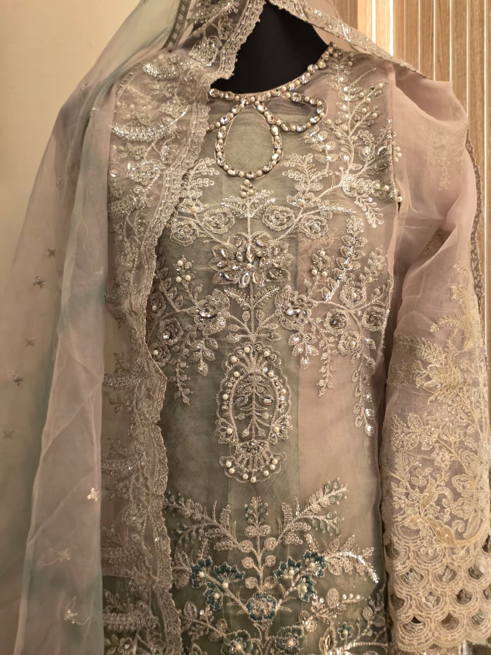 Dusty sage net ensemble exuding bridal luxury: Heavy pearl, crystal & sequin embroidery with cascading floral vines, ornate keyhole neckline, and intricate lace borders. Sheer dupatta with subtle shimmer drapes elegantly. Perfect for weddings, receptions & dreamlike celebrations.