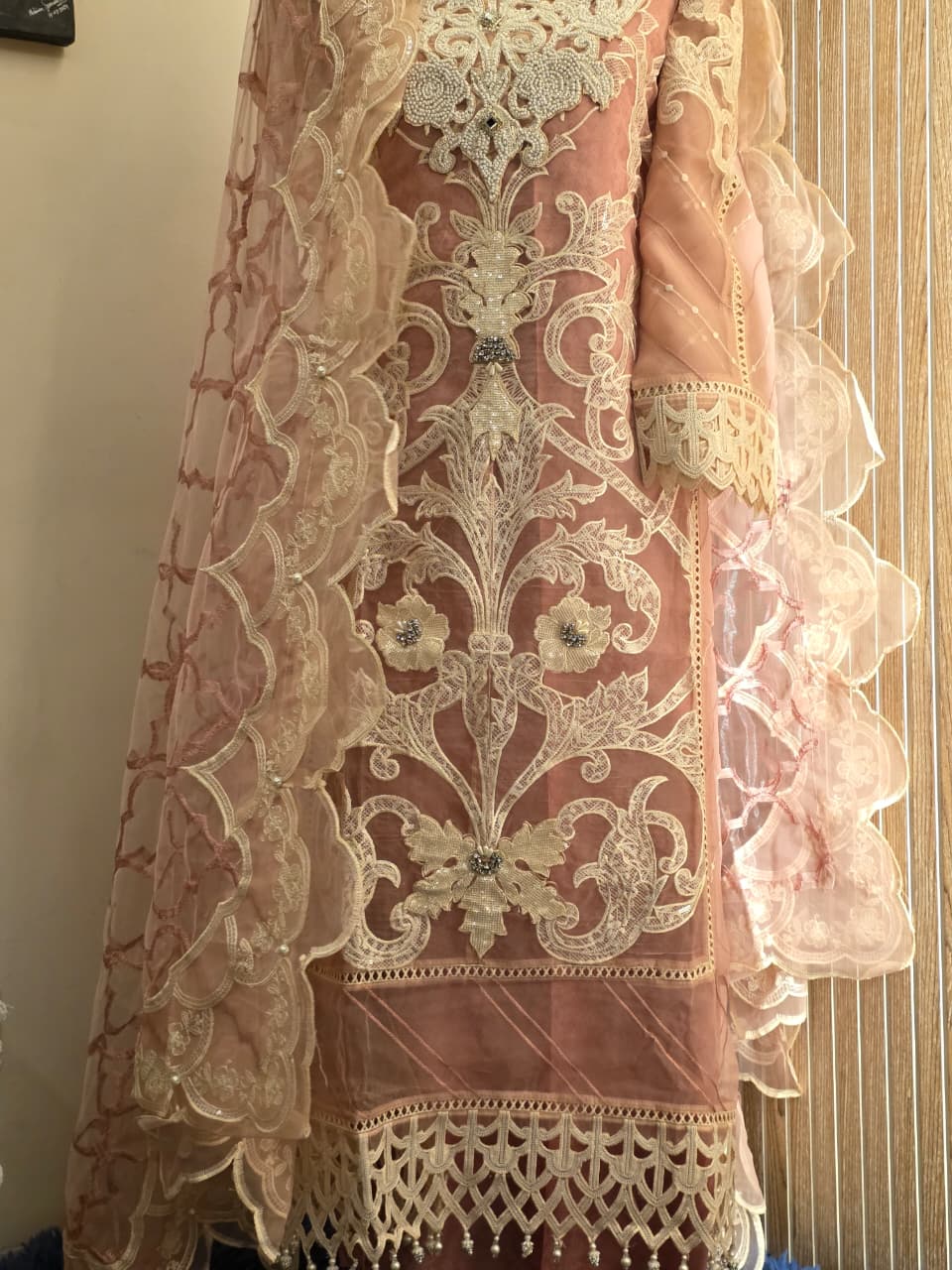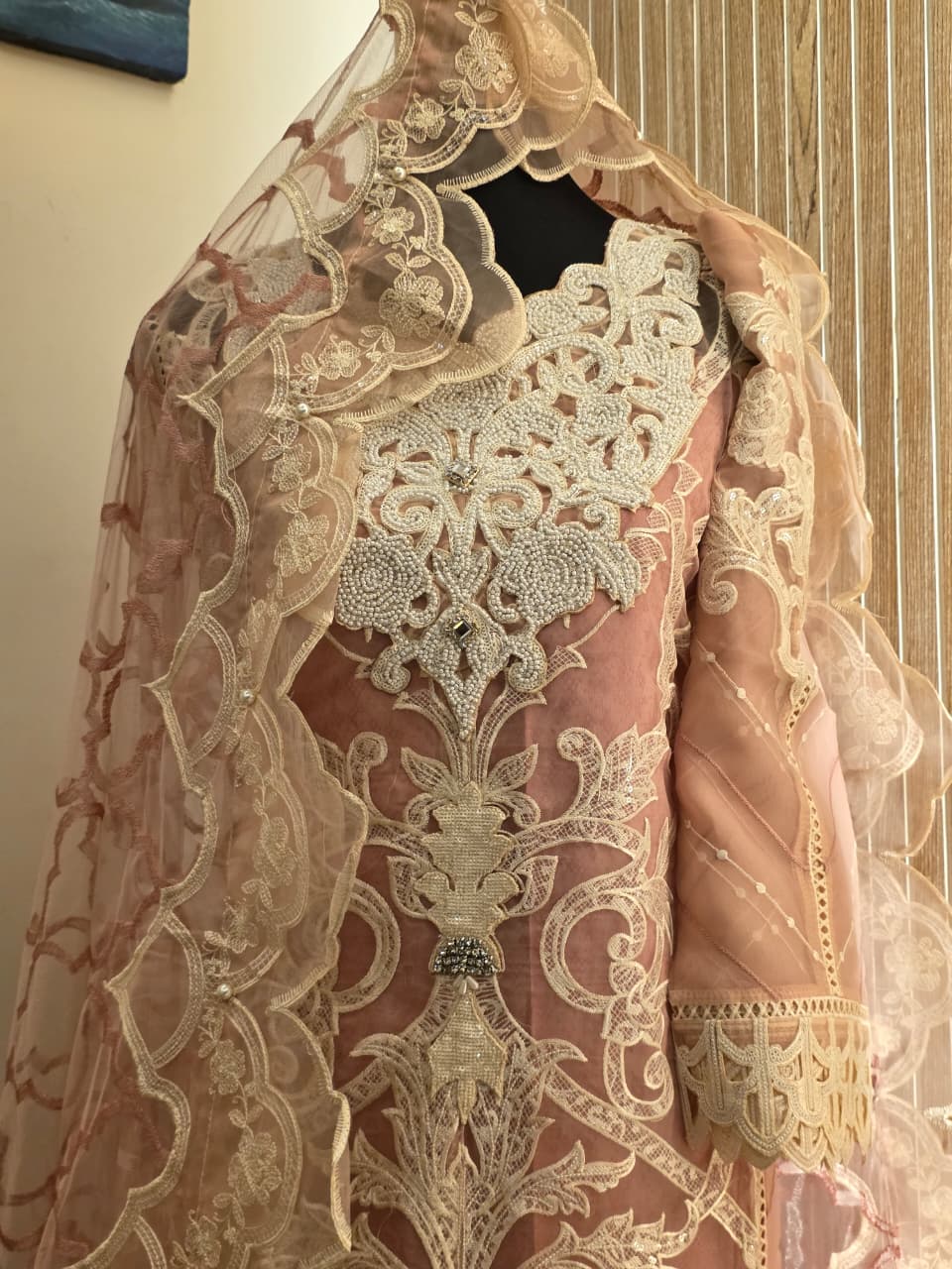 Blush peach net salwar suit blooming with lavish pearl & crystal embroidery, ornate floral arabesque patterns, central gemstone accents, and ruffled sheer dupatta. Scalloped lace hems with dangling pearl tassels add playful luxury. A romantic pick for weddings, parties & ethereal evenings.