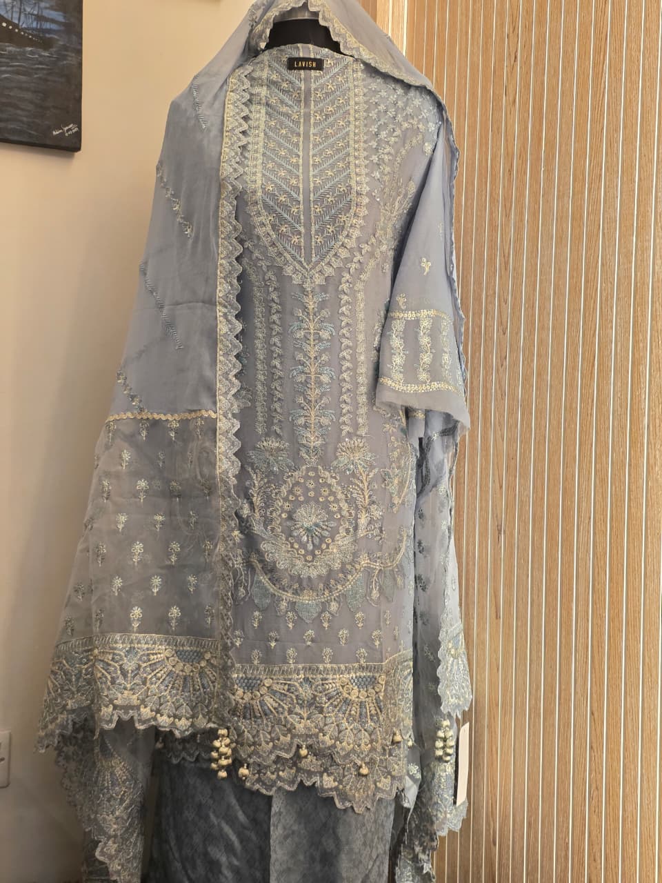 Serenity in soft grey-blue net: Intricate zari & thread embroidery with feather-like motifs, shimmering borders, and dangling tassel accents. Flowing dupatta with scalloped lace edges. Subtle luxury for evening elegance & festive poise.