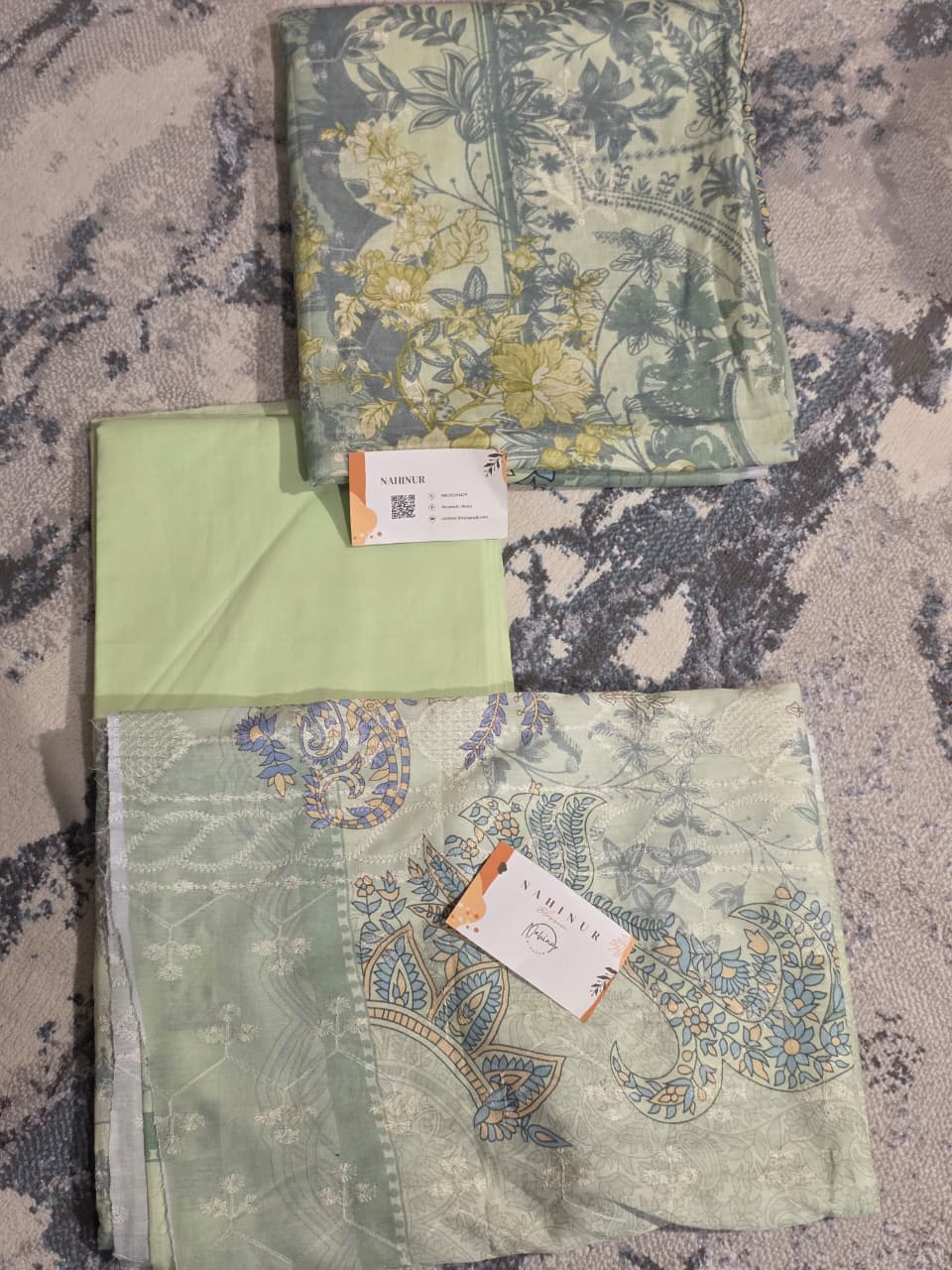 A soft and elegant mint green suit set featuring delicate floral prints and subtle embroidery, paired with a plain matching fabric for a balanced, graceful look. The soothing color palette and lightweight fabric make it perfect for daytime wear, summer gatherings, or effortless everyday elegance. 🌿✨