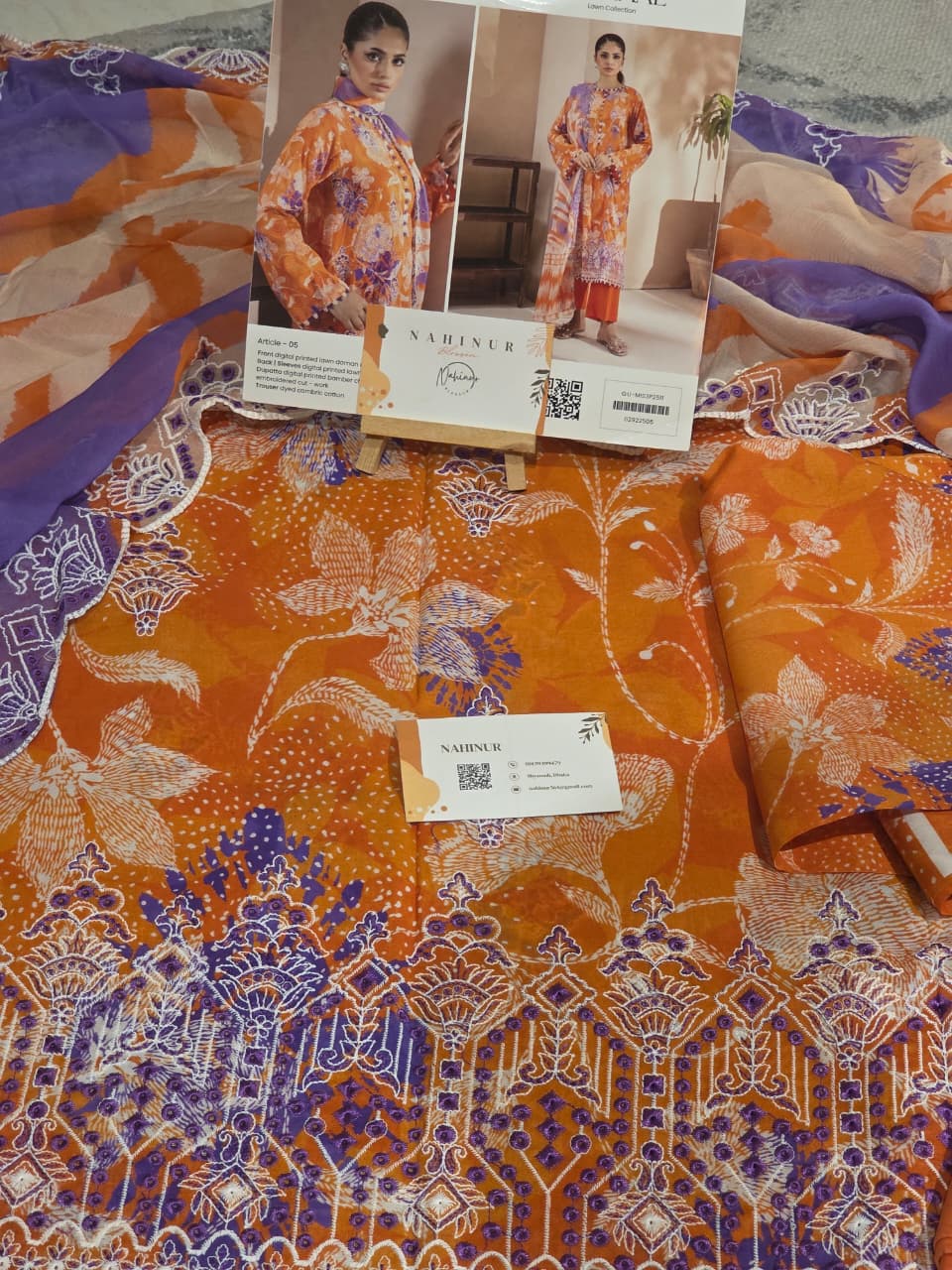 Brighten up your collection with this eye-catching Nahinur lawn suit in a lively orange base accented with intricate purple and blue floral digital prints. Featuring detailed front digital print, border lace-inspired patterns, and a soft purple dupatta with artistic abstract motifs. Paired with a matching orange trouser, this unstitched 3-piece set combines comfort, bold elegance, and modern ethnic charm—ideal for casual outings, summer gatherings, or festive vibes. Premium lawn fabric with tussar-dyed comfort finish.