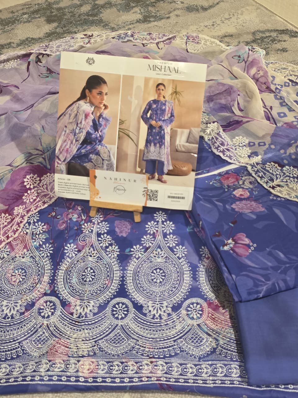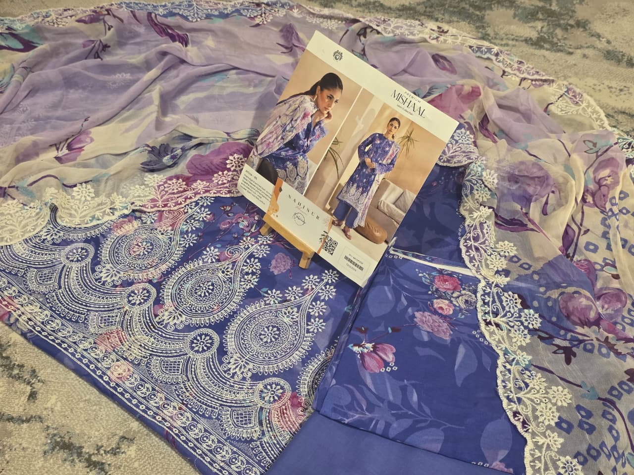 Indulge in serene elegance with this premium Mishaal (Nahinur) 3-piece unstitched lawn suit. The rich royal blue base features stunning digital prints of intricate paisley motifs, floral borders, and delicate white lace-like detailing across the front and sleeves. Paired with a solid blue trouser and a lightweight, flowing lavender-purple chiffon dupatta adorned with soft abstract floral prints and subtle pastel accents. This breathable, tussar-dyed cotton lawn set exudes sophistication and grace—perfect for Eid celebrations, weddings, or refined everyday wear. Timeless ethnic charm meets modern comfort.