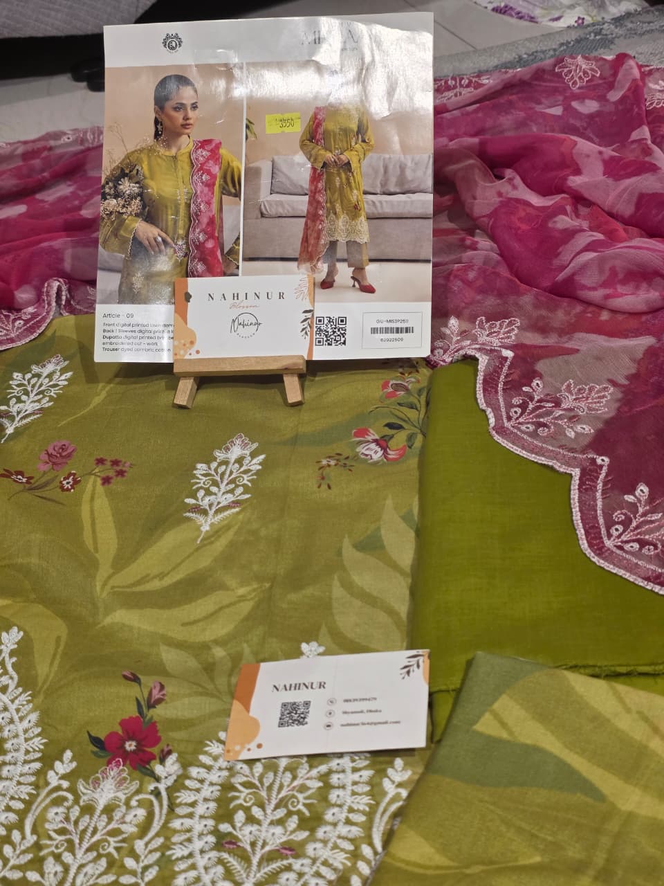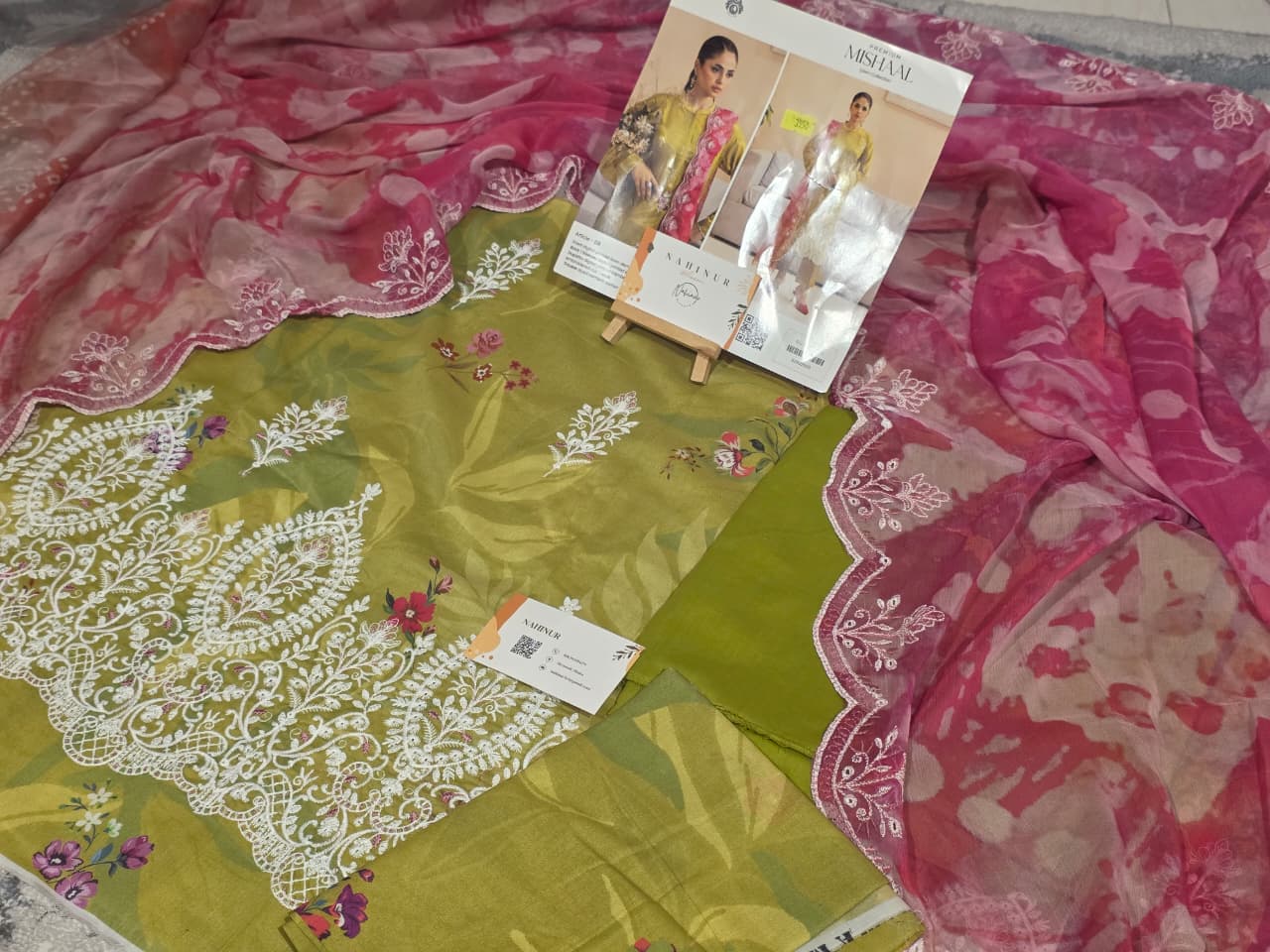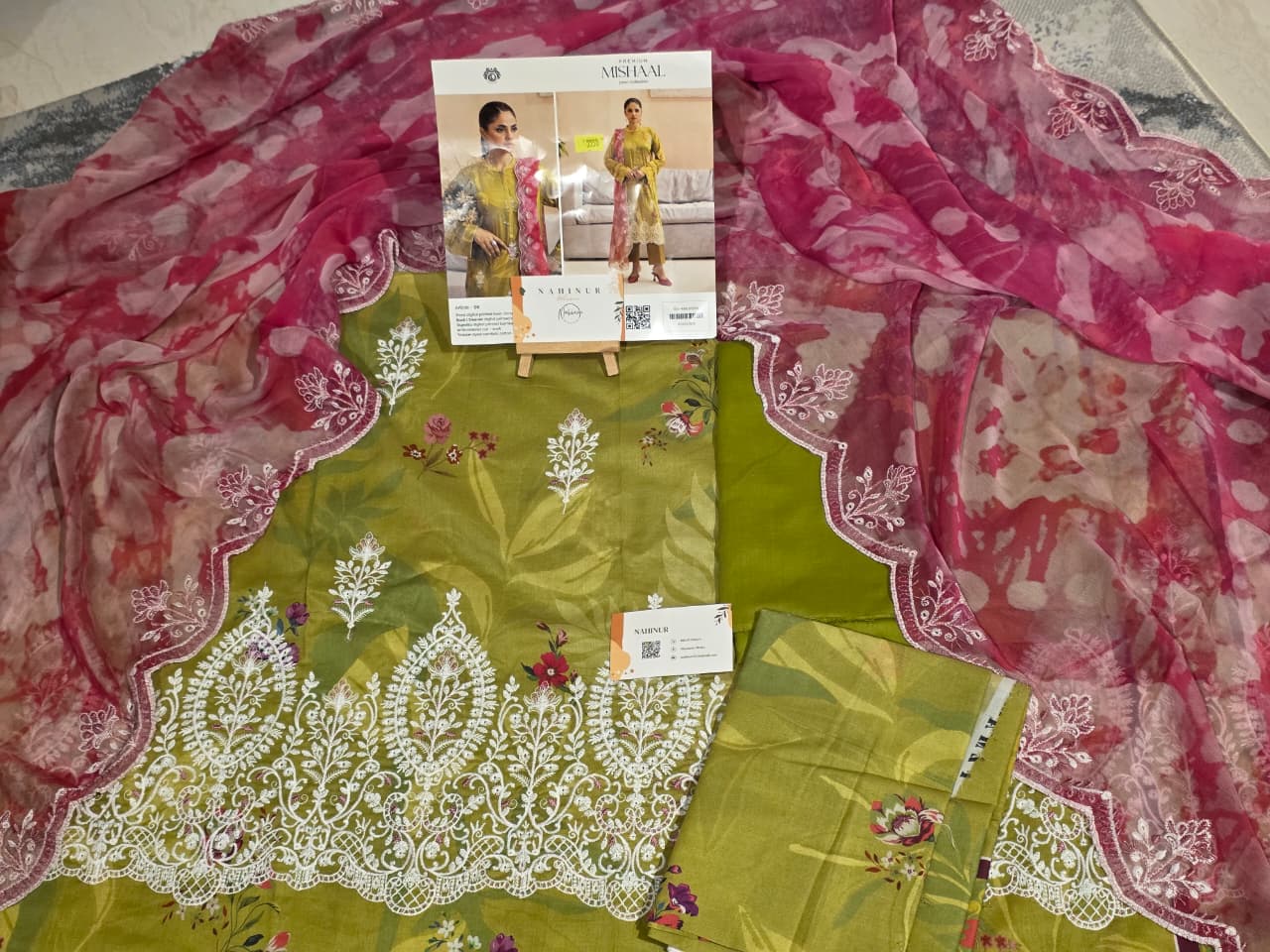 Discover timeless beauty in this vibrant Nahinur Mishaal lawn masterpiece. The rich olive base of the kameez is adorned with beautiful digital prints of blooming flowers and leaves, elevated by ornate white embroidered borders featuring paisleys, vines, and scalloped edges. Completed with a solid olive bottom and a lightweight pink dupatta printed with dreamy floral patterns and bordered accents for a romantic touch. This unstitched 3-piece premium set blends comfort, artistry, and bold color contrast—ideal for celebrations, parties, or stylish everyday ethnic looks that make a statement.