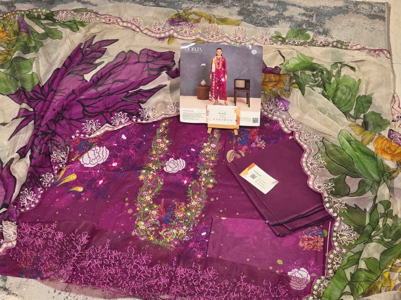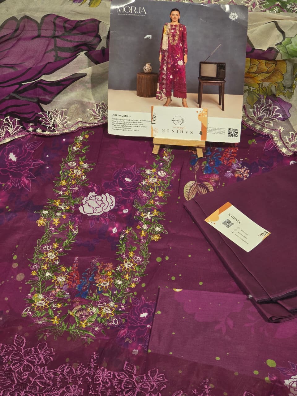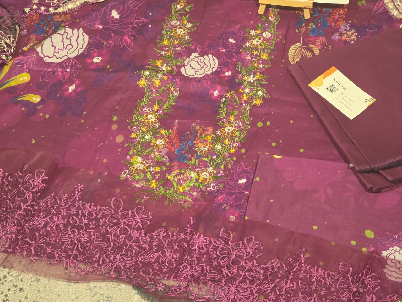 A stunning deep plum / purple unstitched 3-piece lawn suit featuring elegant multicolor floral embroidery on the shirt, highlighted with a beautifully detailed embroidered neckline and a richly finished embroidered hem border. The outfit is paired with a lightweight chiffon dupatta showcasing bold floral prints in shades of purple, green, and ivory with an embroidered scalloped border, while the matching solid plum lawn trouser completes the look, making it a perfect choice for festive and summer wear.