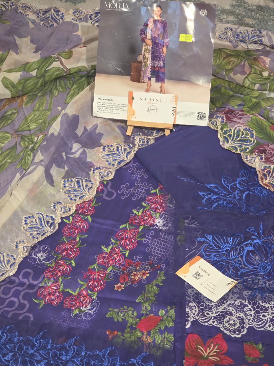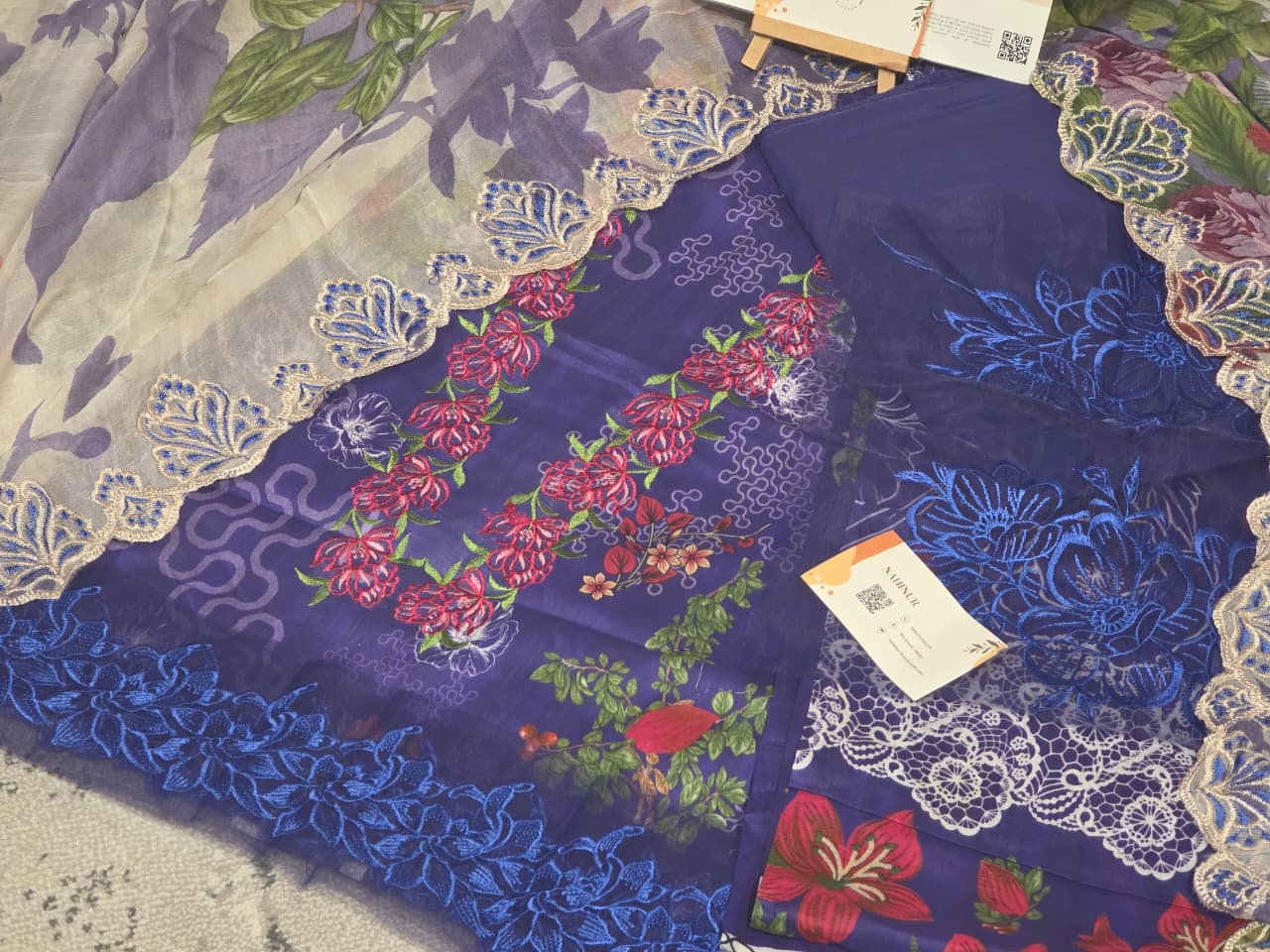 Exude bold sophistication with this unstitched 3-piece suit in a rich crimson red. The ensemble features a premium digital-printed lawn shirt with vibrant floral motifs, accented by an intricately embroidered neckline and a heavy lace-style border at the hem. It is paired with a stunning, translucent cream-colored dupatta featuring oversized floral prints and luxurious scalloped embroidered edges. Complete with solid dyed trousers, this set perfectly balances traditional embroidery with a modern, artistic floral aesthetic.