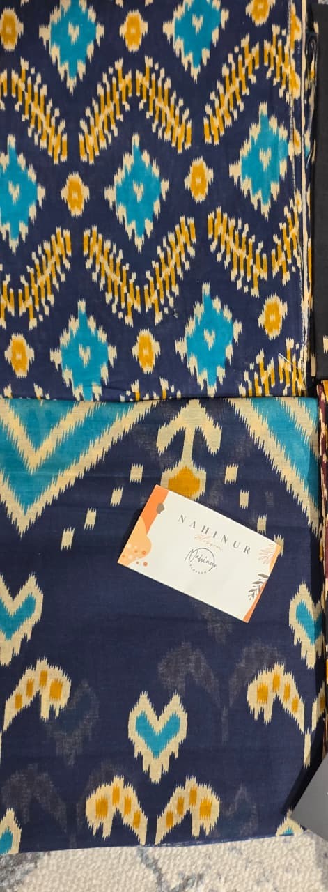 This elegant fabric set features a deep navy blue base beautifully contrasted with teal blue and mustard yellow motifs, creating a rich and sophisticated look. The design showcases traditional geometric and ikat-inspired patterns, where teal accents add freshness and vibrancy, while mustard yellow details bring warmth and depth to the overall palette. The repeating motifs are evenly spaced, giving the fabric a balanced and refined appearance. The combination of dark navy, bright teal, and earthy mustard makes this set perfect for both casual wear and semi-formal occasions, offering a timeless yet contemporary appeal.