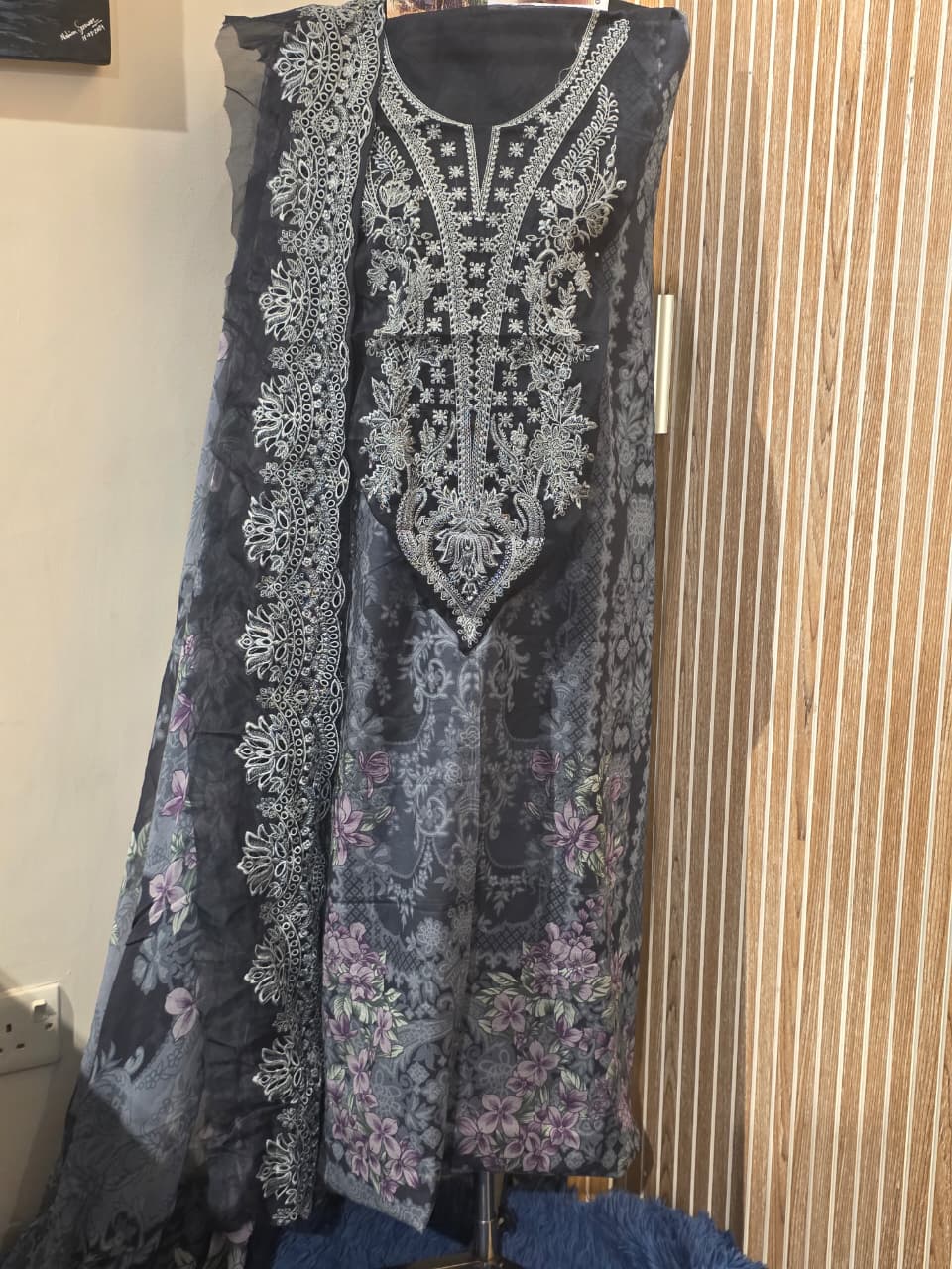A refined charcoal grey / deep slate unstitched lawn shirt featuring intricate silver-white thread embroidery on the neckline, center panel, and side border, beautifully contrasted against a soft printed floral base in muted grey and lavender tones, creating a graceful and sophisticated look ideal for elegant day or evening wear.