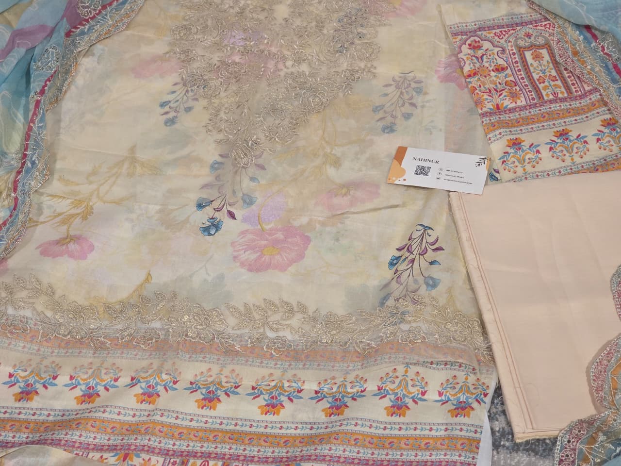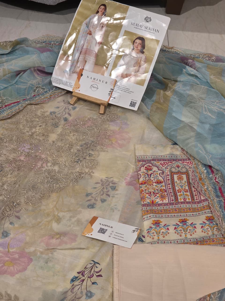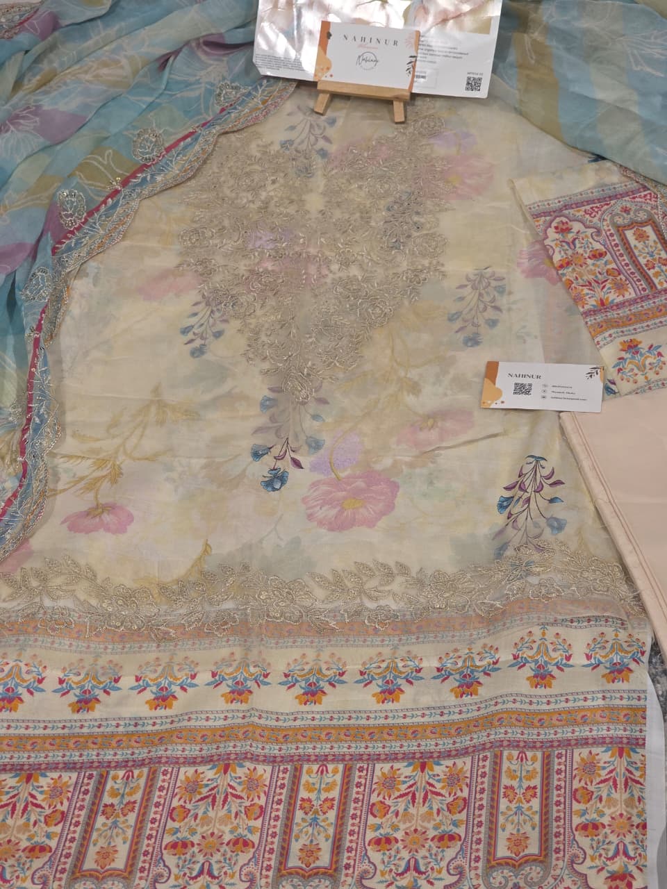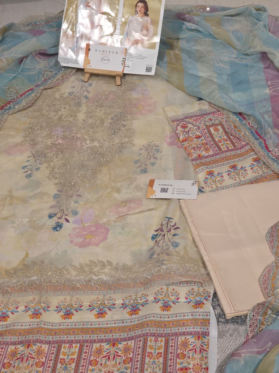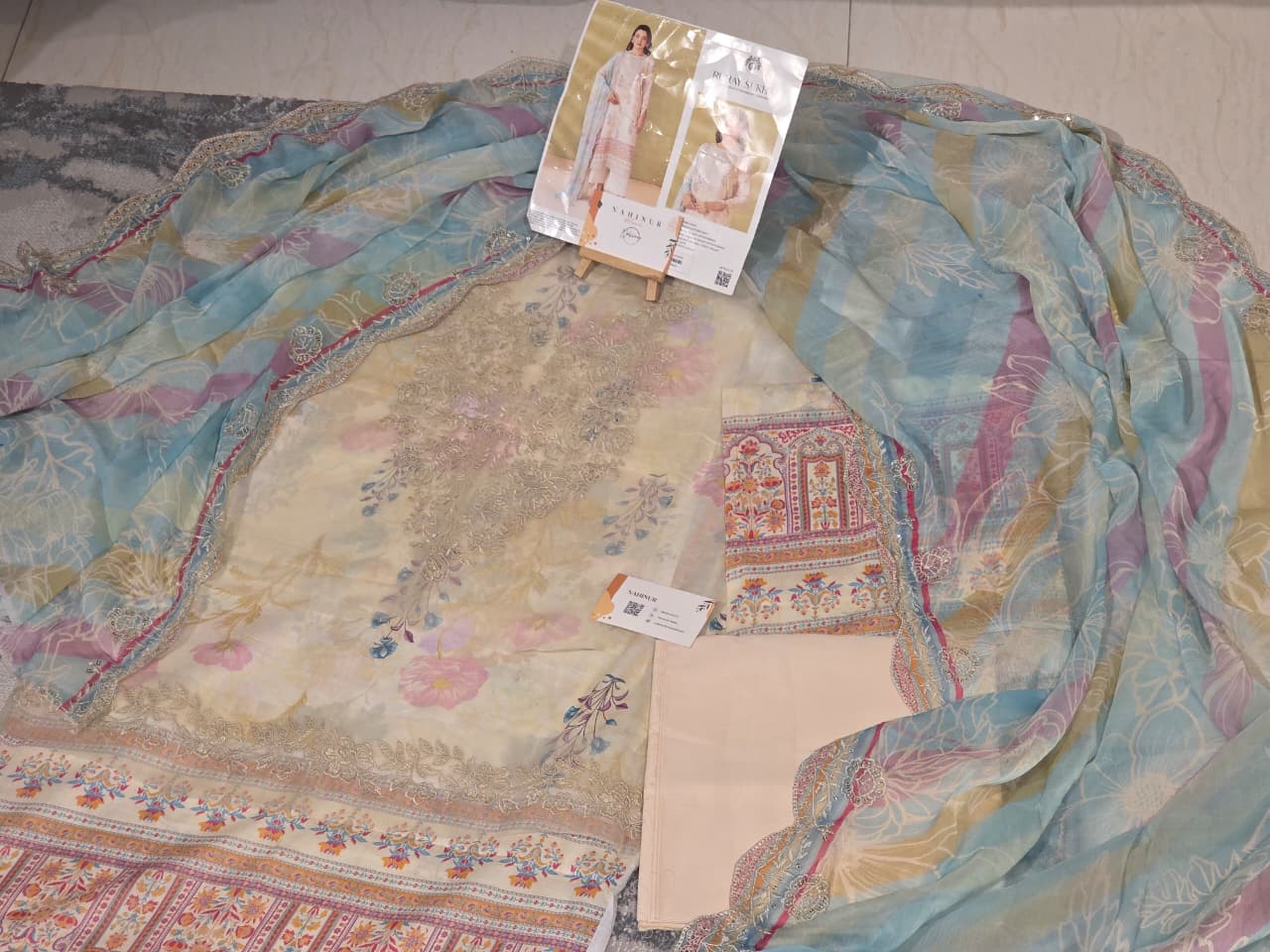 Experience the perfect blend of traditional charm and modern luxury with this Rang Pasand unstitched 3-piece suit. The ensemble features a vibrant mustard digital-printed lawn shirt detailed with a rich, floral-embroidered neckline and a matching paisley-border hem. It is beautifully paired with a statement light blue organza dupatta, which boasts intricate gold-scalloped embroidery and a classic bandhani-inspired print for an elevated look. Complete with solid dyed cambric trousers, this premium set is an ideal choice for festive celebrations or formal gatherings where elegance is key.
